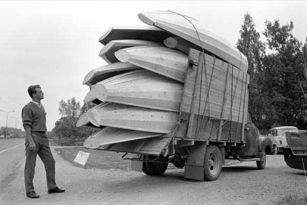 Båtlass foran "Terra motor", Drammensveien. Lastebil med prammer på planet.