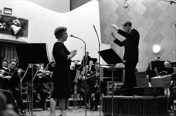 Kringkastingens "Vi går ombord", juleprogram, Oslo, 24.12.1962. Orkester og vokalist. Aase Nordmo Løvberg.
