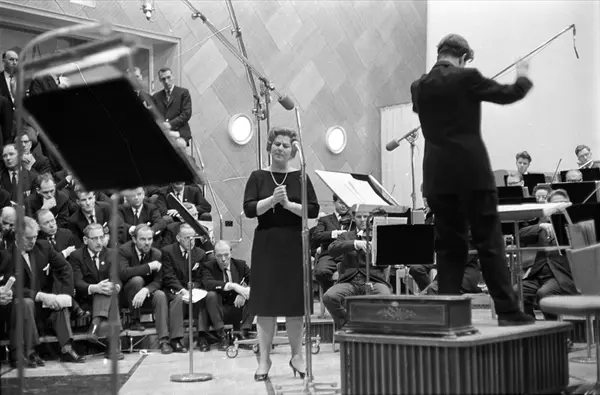 Kringkastingens "Vi går ombord", juleprogram, Oslo, desember 1962. Aase Nordmo Løvberg, orkester og publikum.
