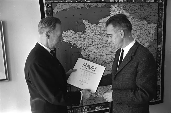 Fransk kultur, Oslo, 03.04.1965. Musikksjef Kristian Lange og Monsieur Francois Neel foran kart over Frankrike.