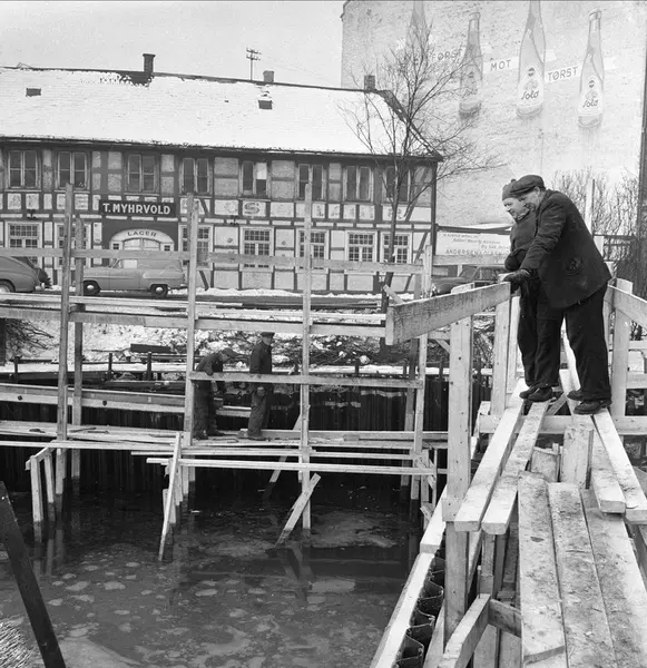 Schweigaards bru, Oslo, 23.02.1956. Anleggsarbeid. Bebyggelse og elva, menn på stilaser. Bindingsverksbygning i Rødfyllgata 12 før riving, nå på Norsk Folkemuseum.