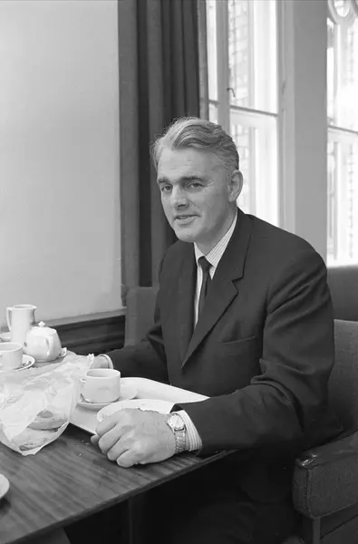Fra Stortinget, Oslo oktober 1965. Kåre Kristiansen (Krf) inntar et måltid.
