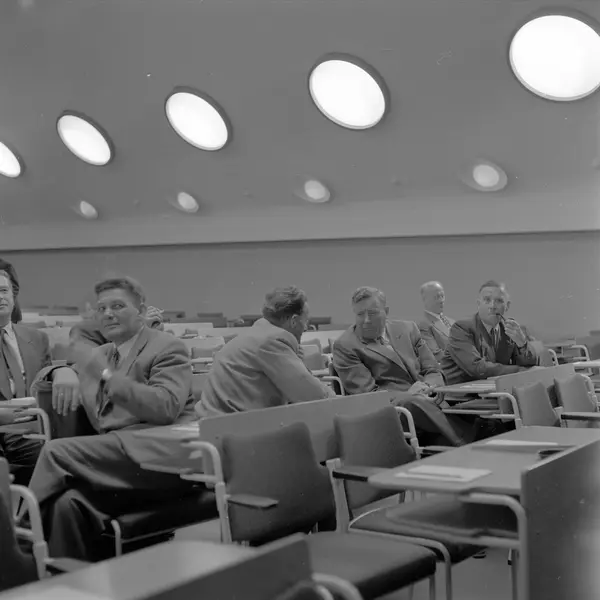 Karl Johans gate 22, Oslo, juli 1958. Stortinget. Komitebehandling av 12 mils fiskerigrense.