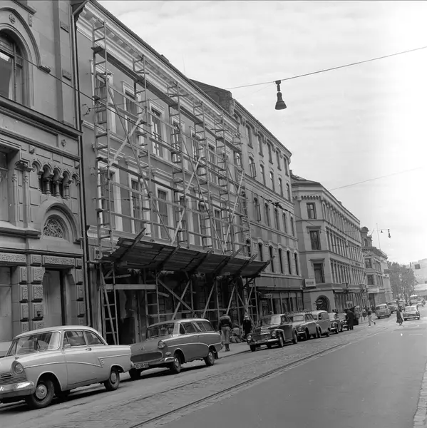 Prinsens gate, Oslo. Sjømannssenter. Bygning under oppussing. Gatebilde med biler av typen Ford Taunus 17M 1958-60, fulgt av Opel Rekord Caravan 1958-60.