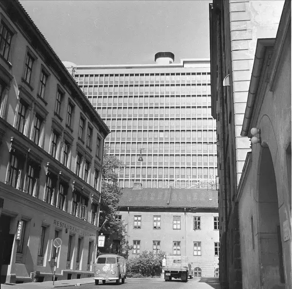 Pløens gate foran Rregjeringsbygget. Justisdepartementets bygning i perioden 1883-1958, til høyre port inn til gårsplassen i Møllergaten 19. Fotografert i Oslo i juni 1958. Gatebilde med bygninger og biler.