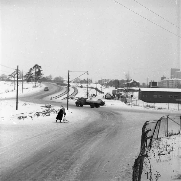 Storoveien med trikkespor ved Sinsenkrysset i Oslo i 1957. Vei og biler i landskap.