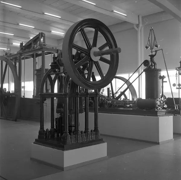 Fyrstikkalleén 1, Oslo, april 1962. Norsk Teknisk Museum. Utstilling, maskiner.