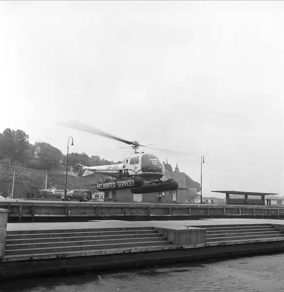 Fra landbruksutstilling på Ekeberg, Oslo, 11. juni 1959. Helikopteret svever over Honnørbrygga utenfor Rådhusplassen og vi ser litt av Akershus slott i bakgrunnen.