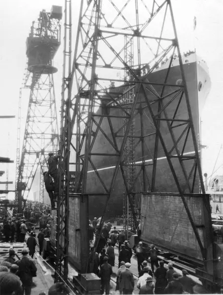 Stabelavløp 25/5-1929, Lastebåten M/S Fernglen, B/N 434. Levert av Akers Mek. Verksted i 1929 til Fearnley & Eger.