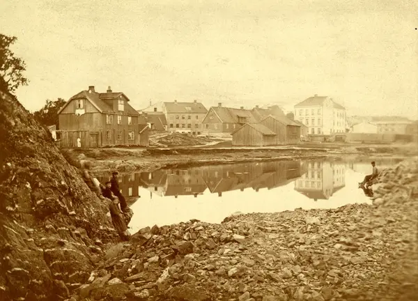 Tekst bak på bildet (overstrøket): Hvordan det saa ut i 1870-aarene hvor nu skibsbyggerihallen og den store tørdok ligger. Til venstre for billedet laa Tyveholmen.