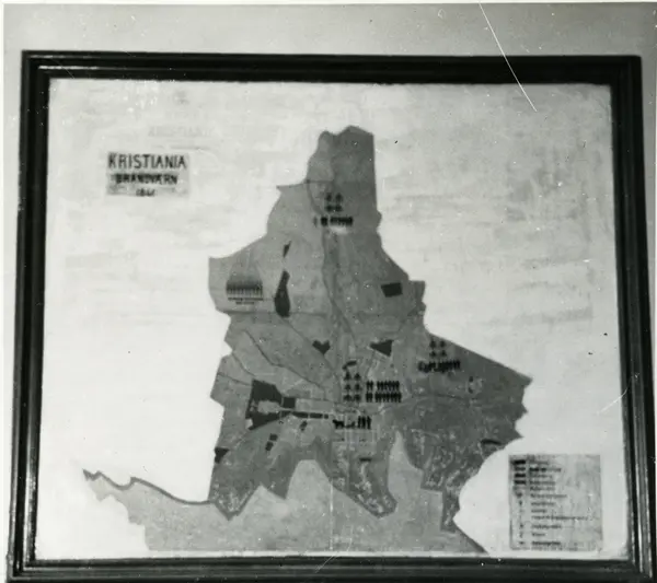 Brannvernutstillingen på Sagene brandstasjon 2.-9. januar 1936. Utstillingen var arrangert av Oslo Brannvesen i anledning Oslo Brandvæsens 75 års jubileum. Kart over Kristiania 1868 med angivelse av brannberedskapen