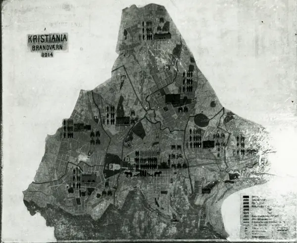 Brannvernutstillingen på Sagene brandstasjon 2.-9. januar 1936. Utstillingen var arrangert av Oslo Brannvesen i anledning Oslo Brandvæsens 75 års jubileum. Kart over Kristiania 1914 med angivelse av brannberedskapen