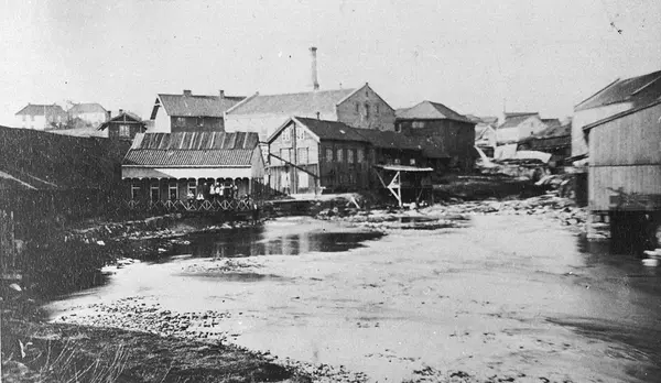 Akerselven sett fra Grünerbroen. Nedre Foss Mølle til høyre, badet ved Bagaas Brug til venstre