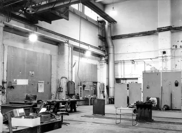 Titan sveiseverksted (tidligere støperiet) ved Myrens Verksted. Felles argontilførselledning langs veggene, avsugsledninger for å få ren luft. Gulvene er oljemalt for å unngå støv