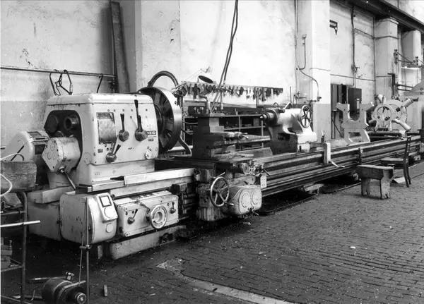 Stor dreiebenk, Heid, ved Myrens Verksted. Verkstedsgulvet er impregnert furukubb for å unngå skader på deler og for å få godt arbeidsunderlag å stå på