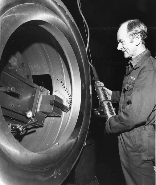 Siste arbeidsdag ved Myrens verksted 25.03.1988, innvendig maskinering av hus for kik til matningsapparat for kontinuerlig cellulosekoker.