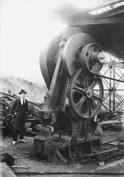 Skrapjernsplassen til Christiania Spiger og Valseverk. Alfred Blaker ved skrapjernssaksen. Saksen er bygget på Nylands mek. Verksted og klippet inntil 5/4" plater