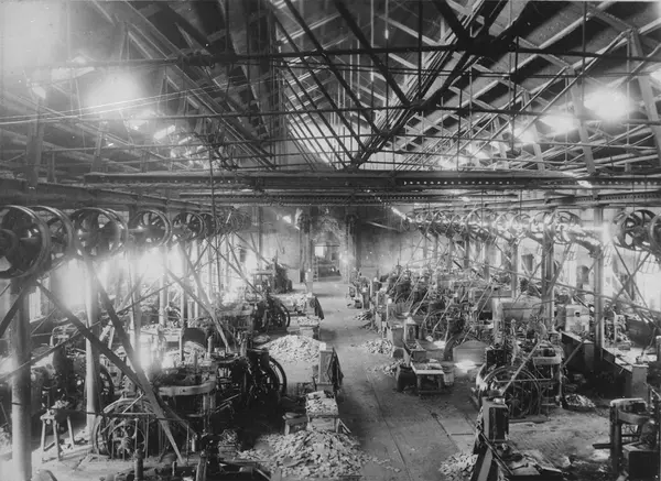 Verkstedinteriør med en rad remdrevne maskiner på hver side av midtgang, Christiania Spigerverk 1895-1905