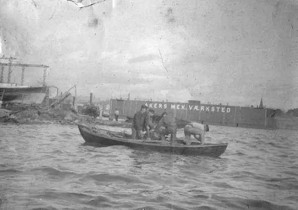 Robåt med fire personer utenfor Flytedokken til Akers mekaniske værksted, Kristianiafjorden