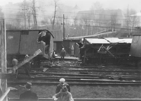 Sammenstyrtning av broen over jernbanen i Oslogate, ødelagte jernbanevogner