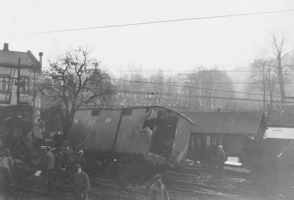 Sammenstyrtning av broen over jernbanen i Oslogate, ødelagte jernbanevogner nord for broen