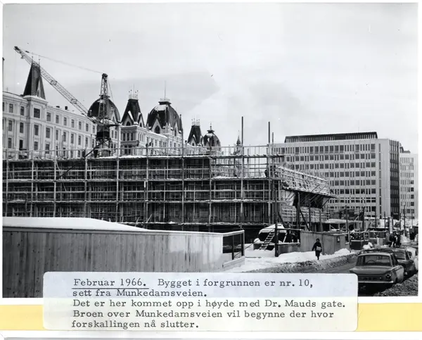 IBM - Dronning Mauds gate 10 og 11, februar 1966. Bygget i forgrunnen er nr. 10, sett fra Munkedamsveien. Det er her kommet opp i høyde med Dr. Mauds gate. Broen over Munkedamsveien vil begynne der hvor forskalingen nå slutter.