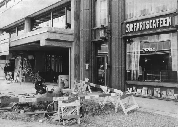 Byggeplass for Oslo teledistrikts nye telefonhus. Kongensgate 6, Sjøfartsbygningen Sjøfartskafeen