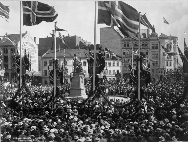 Avdukingen av Tordenskiolds monument på Tordenskiolds plass (tidligere plass i det gamle Pipervika) 17. mai 1901. Statuen er utformet av Axel Ender og sokkelen er tegnet av Henrik Bull. Statuen står nå på Rådhusplassen. (Oslo byleksikon)