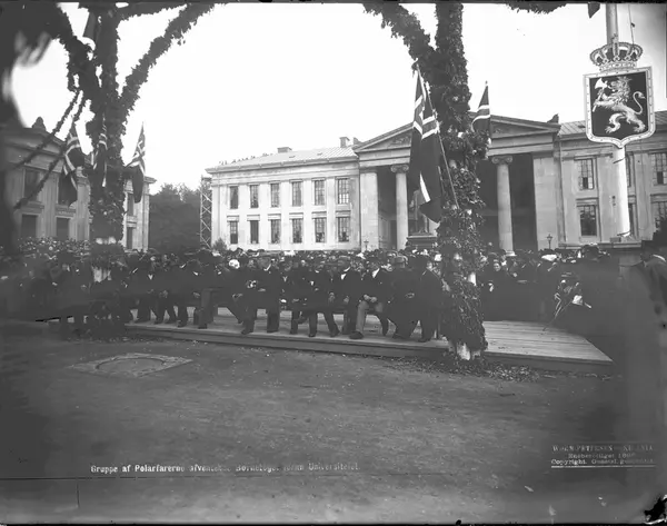 Polfarerne avventer barnetoget utenfor Universitetet på Karl Johan. Den norske løve og unionsflagget er heist.