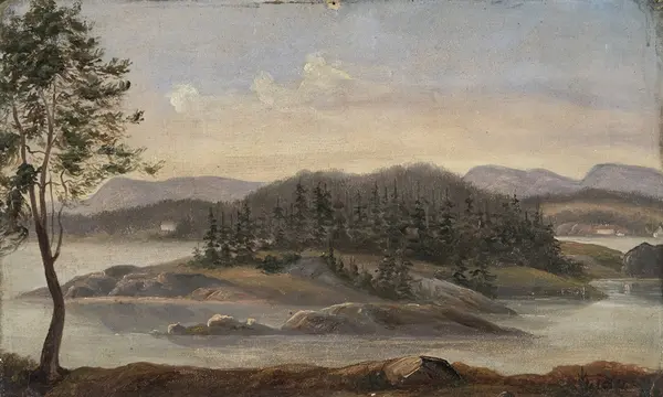 Beskrivelse: I forgrunnen tv et tre på smal landstripe. I mel- lomgrunnen trebevokst holme med svaberg. I bakgrunnen Bygdøy og bakenfor den Skaugumsåsen og Kolsås.
