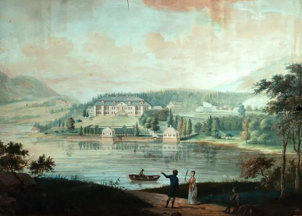 Bogstad sett fra syd. I forgrunnen en sti hvor en mann og en kvinne står. Th sitter en mann på en stubbe. På vannet en mann som ror en båt. I mellomgrunnen tre paviljonger som speiler seg i Bogstadvannet. I bakgrunnen hovedbygningen på Bogstad med fasaden
