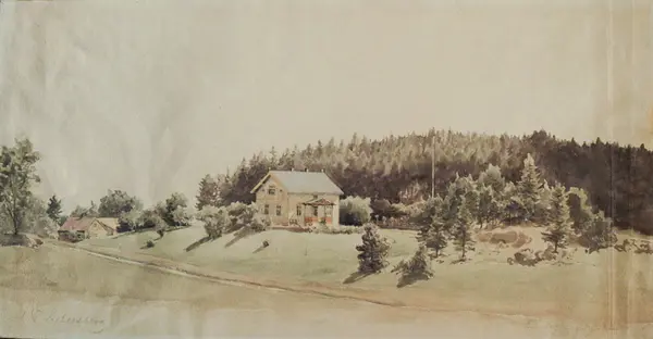 Midt i bildet ligger Fredensborg et hus i sveitserstil med veranda foran inngangsdøren. I bakgrunnen skogholt. Tv énetasjes hus og taket fra et annet.