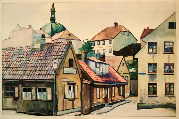 I forgrunnen hushjørne med tekst på gavlen: Skomaker. I bakgrunnen på knaus to-etasjes hus med halv-valmtak. Tv i bakgrunnen kuppelen fra Trefoldighetskirken