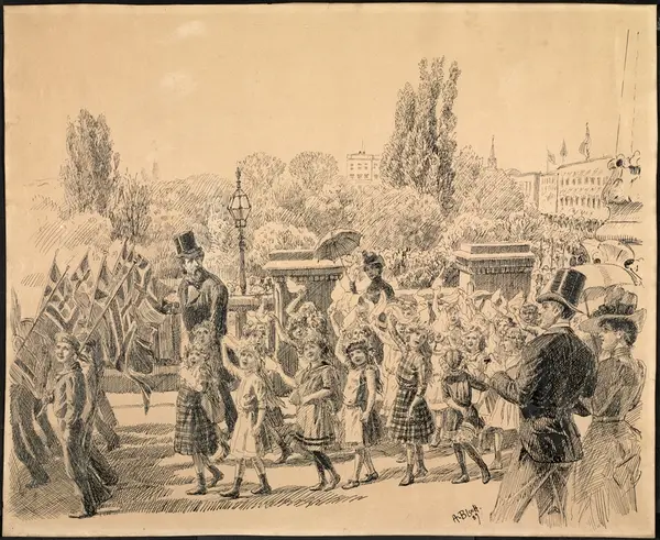 Motivet viser barnetog 17. mai 1889 som går over Løvebakken. Sett fra Stortingsbygningen. Forrest gutter i matrosdress og med flagg. Etter dem følger en herre med flosshatt i spissen for en gruppe jenter. Et par tilskuere står langs siden.