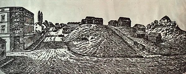 Tekst på baksiden: Denne pennetegning fremstiller de stedlige forhold hvor nu Trefoldighedskirken staar fra tiden omkring 1853. Fra venstre følger husene som nom. 1 Haker Eriksens hus. videre Malteby. Banksjef Dybvads have og hus.