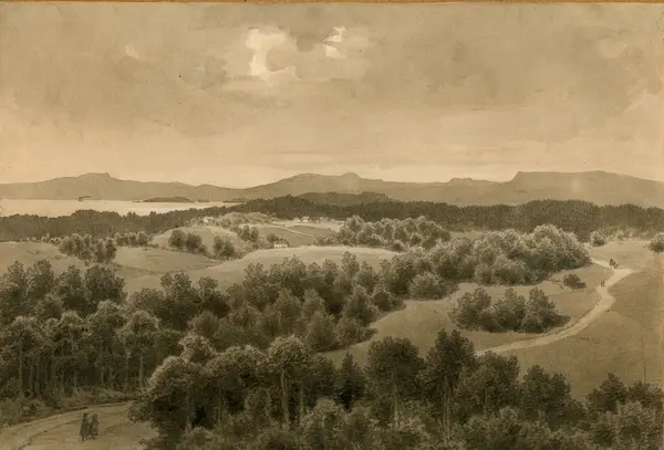 landskap, bakkete landskap med klynger av trær og busker spredte hus