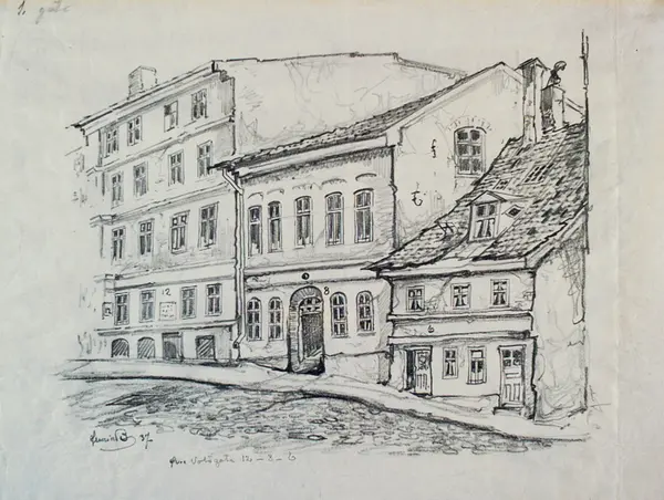 Motivet viser tre hus med varierende etasje-høyde. Th det minste hus med to lave etasjer og ark på taket som har svai nederst.