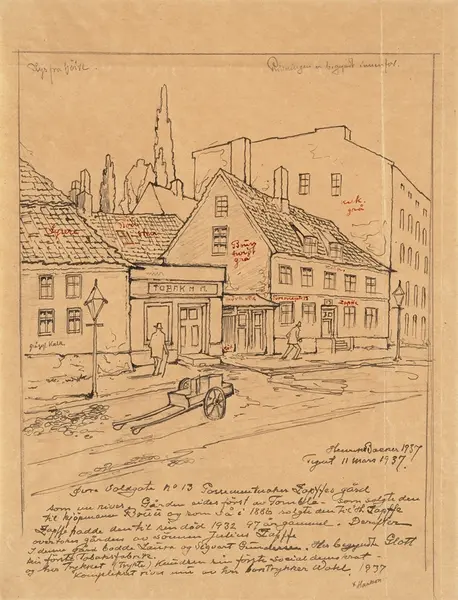 Nederst på tegningen står: Øvre Voldgate no 13 Possementmaker Zapffes gård som nu rives. Gården eides først av Tornbla - som solgte den til kjøpmann Bruu og som så i 1886 solgte den til H.Zapffe. Zapffe hadde den til sin død 1932 97 år