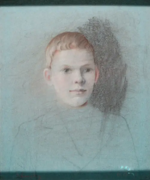 Portrett av ung gutt. Brystbilde. Ansiktet en face en anelse vendt mot høyre. Øynene ser drømmende fremfor seg. Kort lyst hår rett nese og litt fyldig munn.