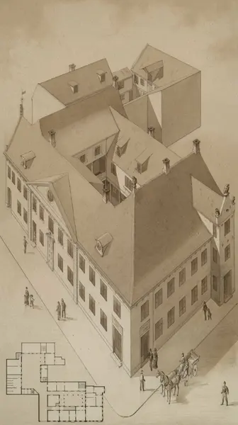 Isometritegning og plan over Cappelengården. Sett fra hjørnet Kirkegata/Tollbugata. På dette hjørnet er det vist butikksvindu mot Kirkegata og butikksinngang mot Tollbugata.