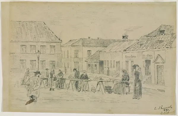 Beskrivelse: I forgrunnen torghandel. I bakgrunnen hus som om- kranser torget. Tv Brogården der det var gjestgiveri (revet 1972). Th hus med teksten: Knudsen Ole Olsen / Klædeshand