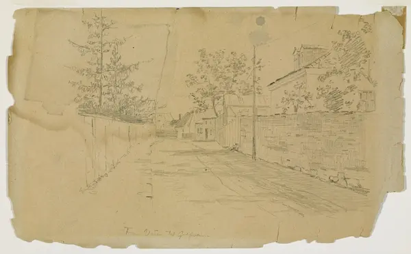 Beskrivelse: En vei går fra forgrunnen innover i bildet. Th hus bak høyt gjerde. Tv gjerde med trær bak.