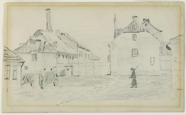 Beskrivelse: Bygninger fra slaveriet på Akershus. Th en vakt med gevær på skulder. Tv 2 kanoner.