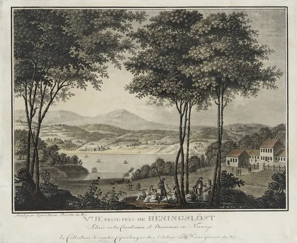 Beskrivelse: I forgrunnen sitter et selskap kledd i tidens drak -ter og med store nistekurver. Th ligger Henningslyst. Nedenfor ses Frognerkilen. I bakgrunnen th ligger Frogner Hovedgård.