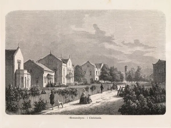 Oscarsgate med murvillaer med middelalderinspi- rerte detaljer. I forgrunnen tv står en herre med en hund og snakker med en dame på den andre siden av et hagegjerde. xylografi etter tegning av Boll