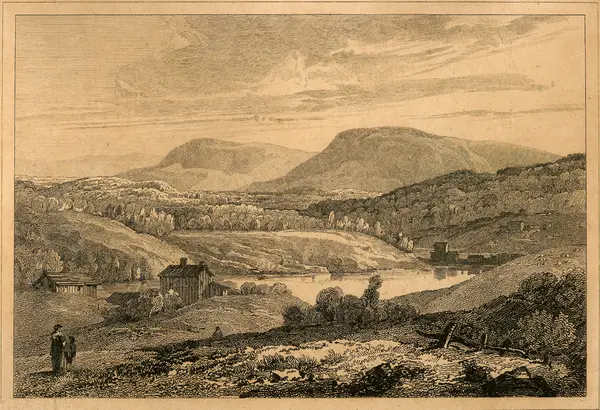 I mellomgrunnen Lysakerelva med bakkete landskap rundt. Små hus og gårdsbruk ligger spredt rundt. I bakgrunnen høye åser.