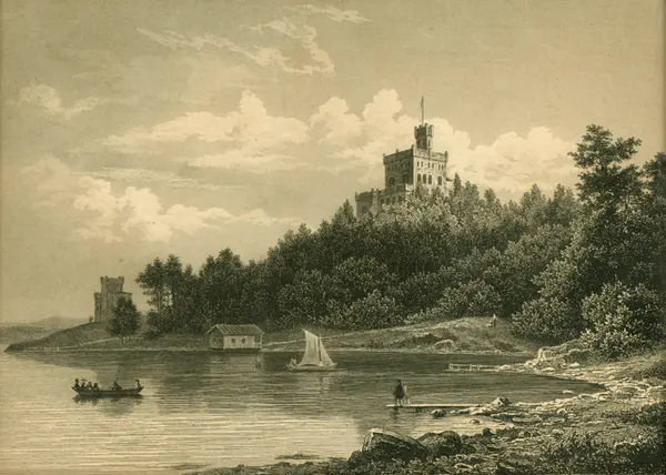 Oscarshall sett fra Frognerkilen. Bygningen delvis skjult af busker og trær. I forgrunnen på Frognerkilen to små båter den ene med seil den andre en robåt.