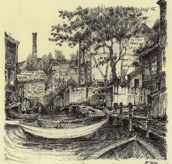 I forgrunnen ligger robåter fortøyet langs Akers- elvas bredd. Th hus med plankegjerde ned mot elva. Et stort tre dekker delvis et tre-etasjes hus med bindingsverksgavl.