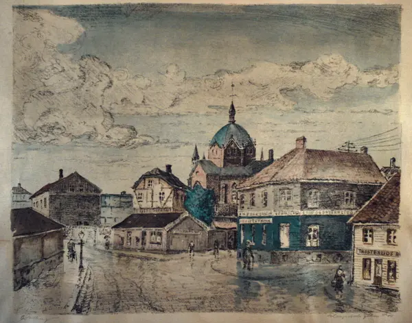 I forgrunnen og innover mot venstre går Hospitalsgata. I bakgrunnen Trefoldighetskirken. I forgrunnen th hjørnet av et hus med skilt pålydende: TROSTERUDS B......";";";";";magasin