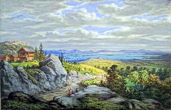 I forgrunnen tv ligger tre laftede tømmerbygninger på fjellknaus. Ved siden av loftet en mann som hugger ved. En kvinne sitter ved siden av. Neden for knausen th står en kvinne med et barn ved hånden og snakker med en sittende mann. I mellomgrunnen er Christiania by.